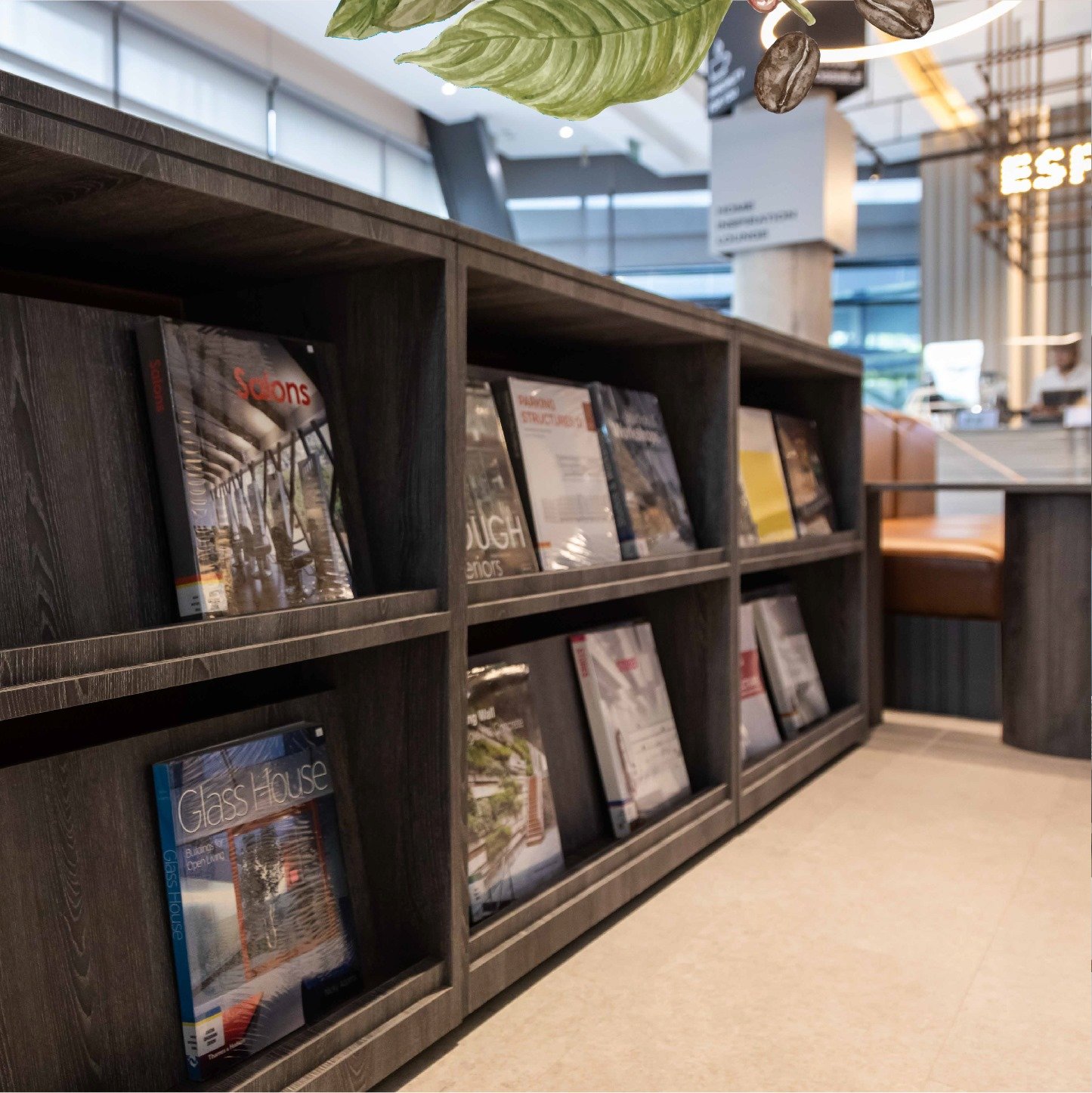 บรรยากาศภายในร้านสบายๆ จะมาเป็นกลุ่มหรือมาเดี่ยวก็เลือกมุมที่เหมาะได้อย่างลงตัว พร้อมมุมหนังสือเรื่องบ้าน รวบรวมหนังสือทั้งไทยและต่างประเทศมาให้คุณค้นหาไอเดียเรื่องบ้าน